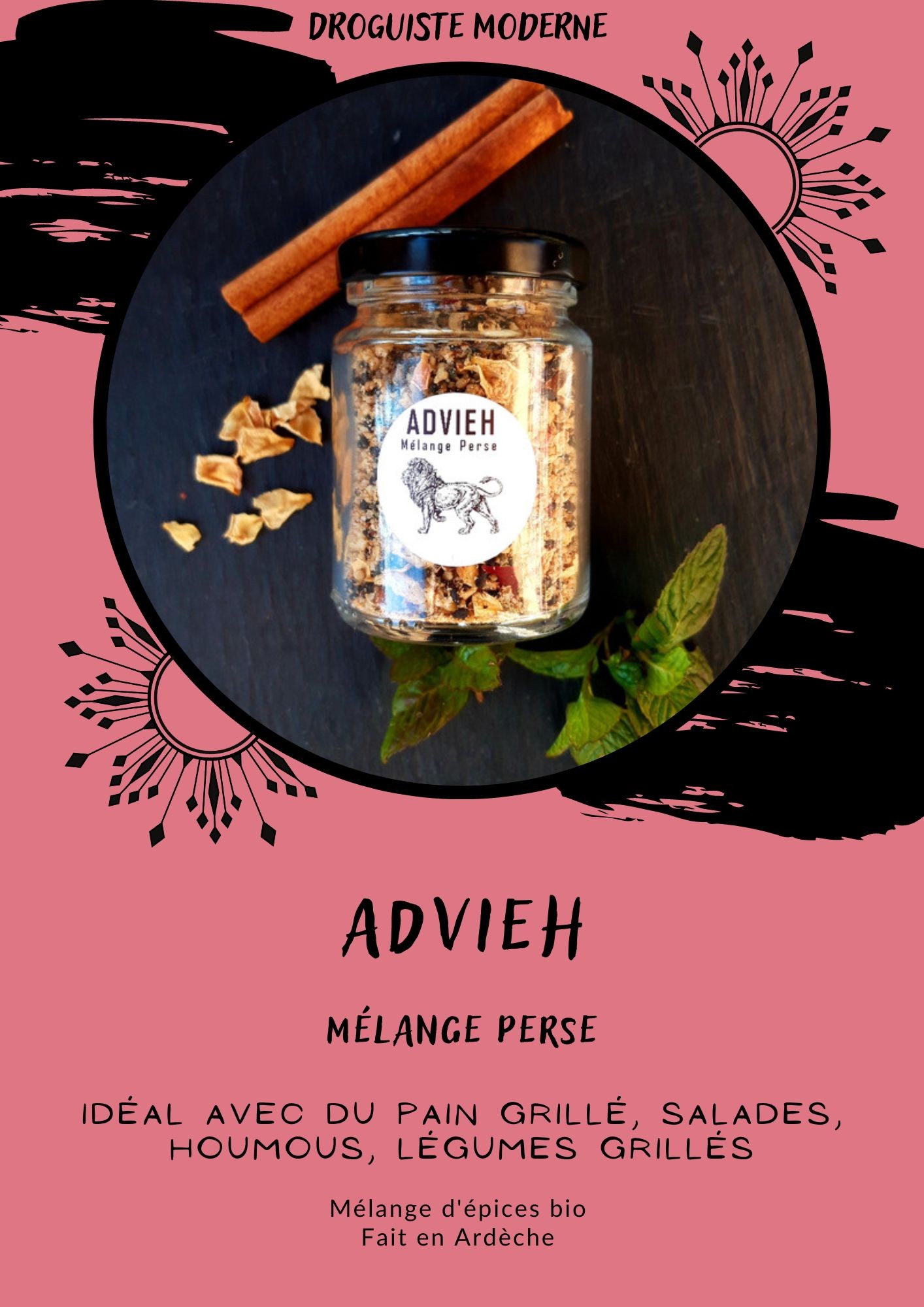 Advieh signifie " épices" en Persan, chaque famille a sa recette. Il contient 5 épices et des fleurs et des plantes.